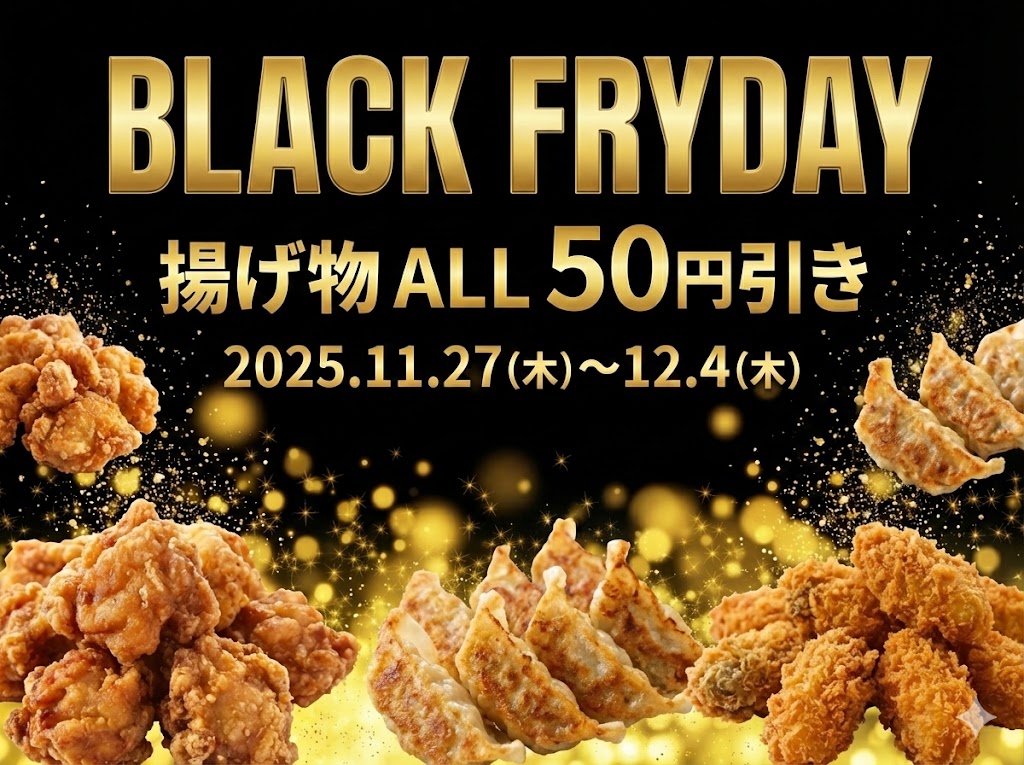 【予告】今年のブラックフライデーは…「BLACK FRYDAY」!?餃子家 龍で揚げ物祭り開催!🍤🍗