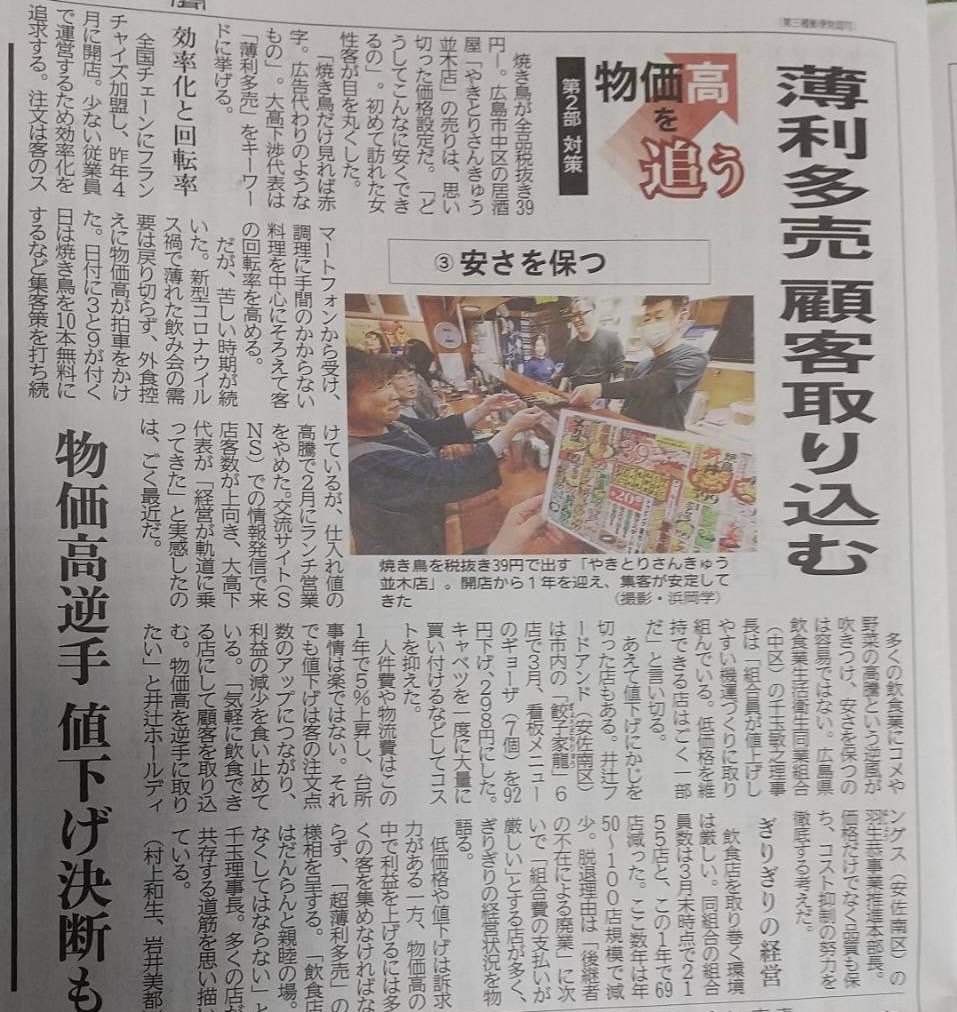 本日、2025年4月22日(火)発行の中国新聞 朝刊 経済面にて、当店の焼き餃子価格改定に関する取り組みが紹介されました。