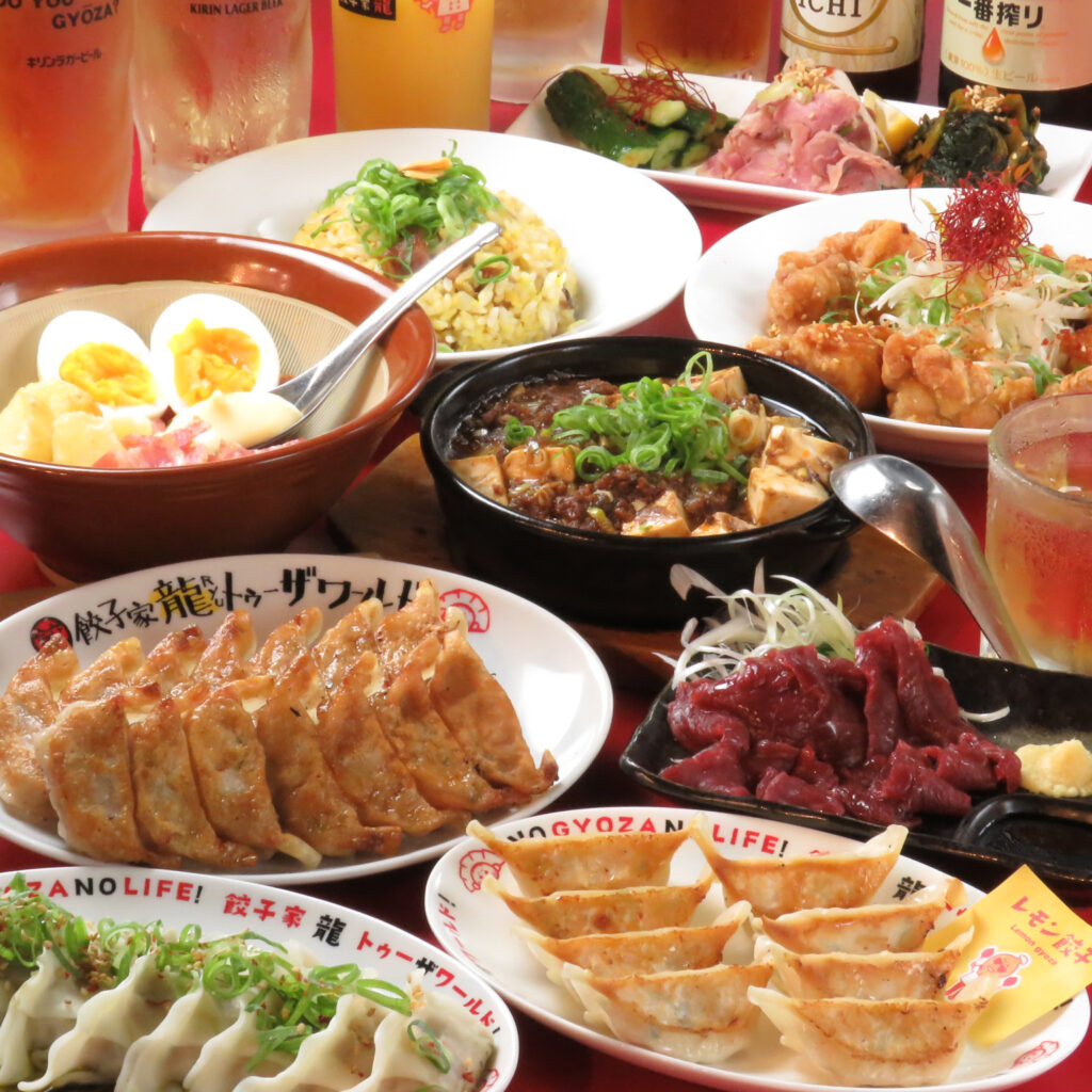 【2H飲み放題付】女子会・飲み会・打ち上げ・歓送迎会・におすすめ♪餃子家龍の2大人気の餃子やポテサラ、エビマヨが入った【安心・定番コース】5000円(税込)と幹事様も安心広島市内での宴会は餃子家龍におまかせ♪