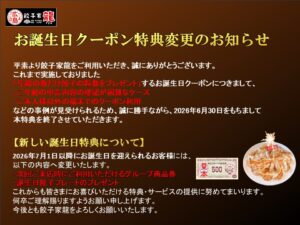 平素より餃子家龍をご利用いただき、誠にありがとうございます。 これまで実施しておりました「年齢の数だけ餃子の粒数をプレゼント」するお誕生日クーポンにつきまして、 ・ご年齢の申告内容の確認が困難なケース・ご本人様以外の端末 […]
